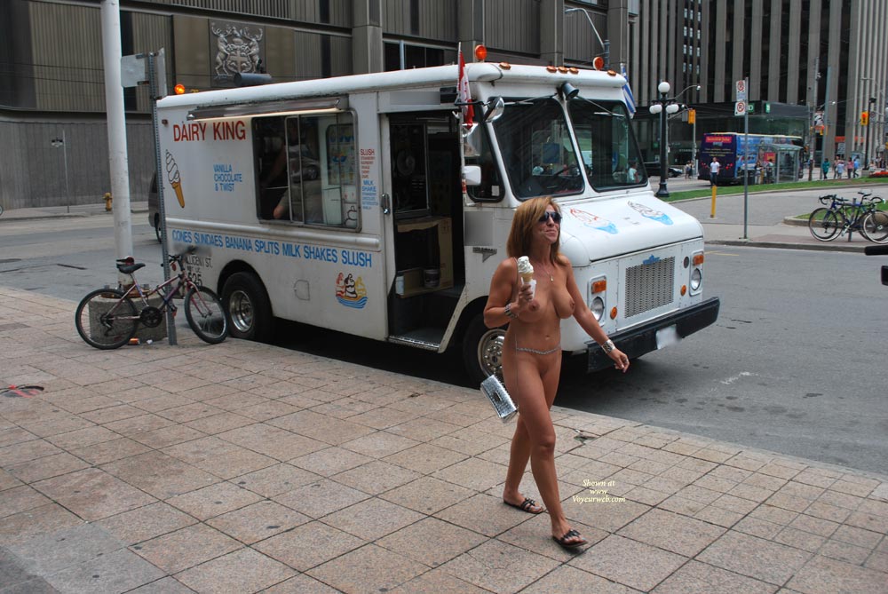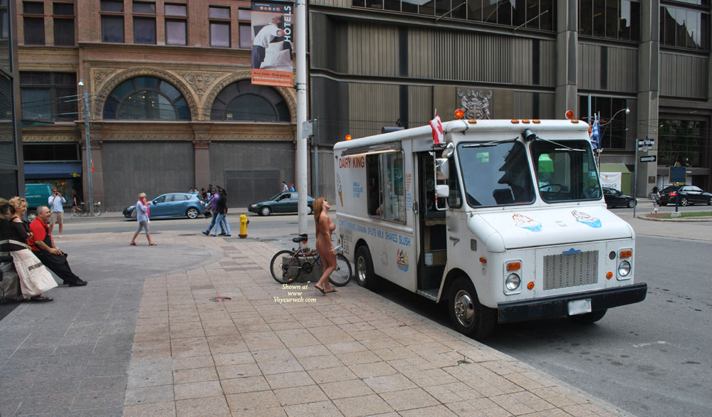We dared Toni to buy an ice cream from a street vendor nude, and she did. This is just off Queen street in downtown Toronto, right next to the Eaton's Centre. She is pretty brave about going nude in public, she has been doing it a lot this year. The ice cream guy could not believe it, he kept saying that in 30 years, nothing like this had ever happened before.