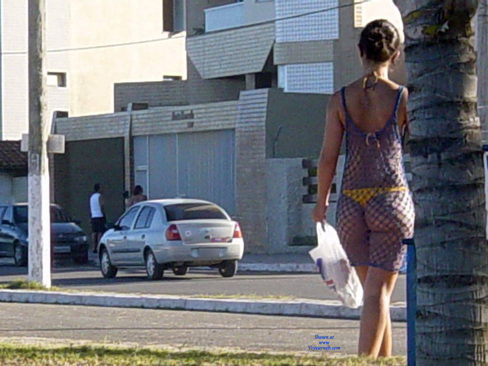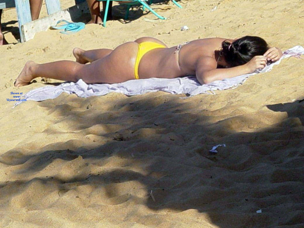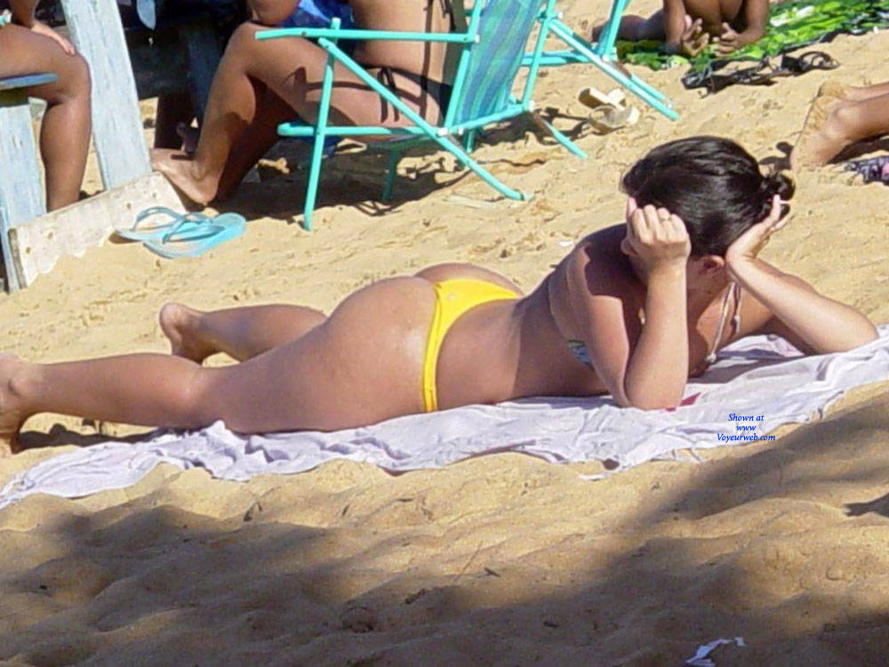Deliciosa casadinha e seu biquini anmarelo na praia do Janga, exibindo sua bunda para os machos que passavem, com esse biquini todo socado no meio do rego.