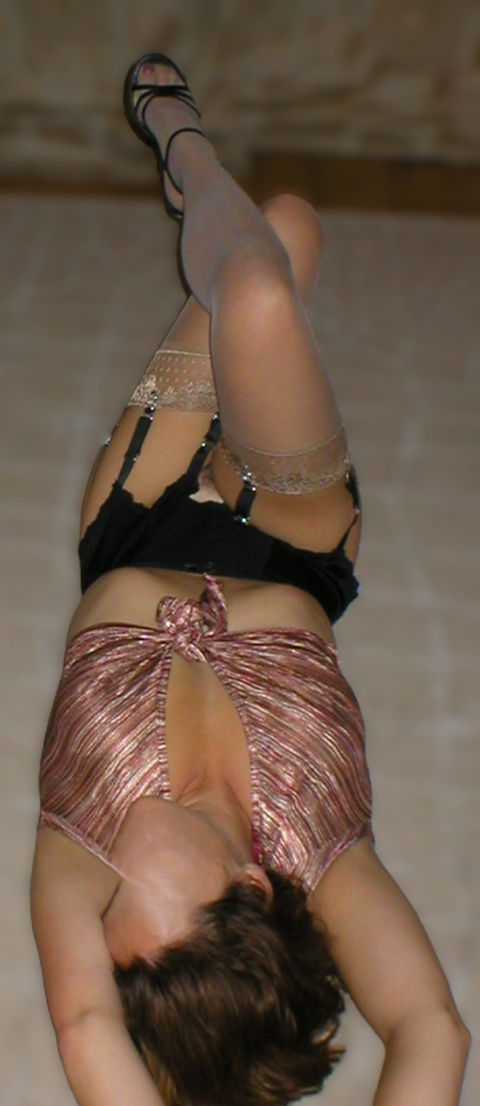 My first post here! Wearing my waist -tie top, sheer, nude stockings ,six-strap suspender belt and strappy, platform "stripper" sandals. After some posing and leg crossing, my top eventually falls open ,exposing my 36DD breasts ...